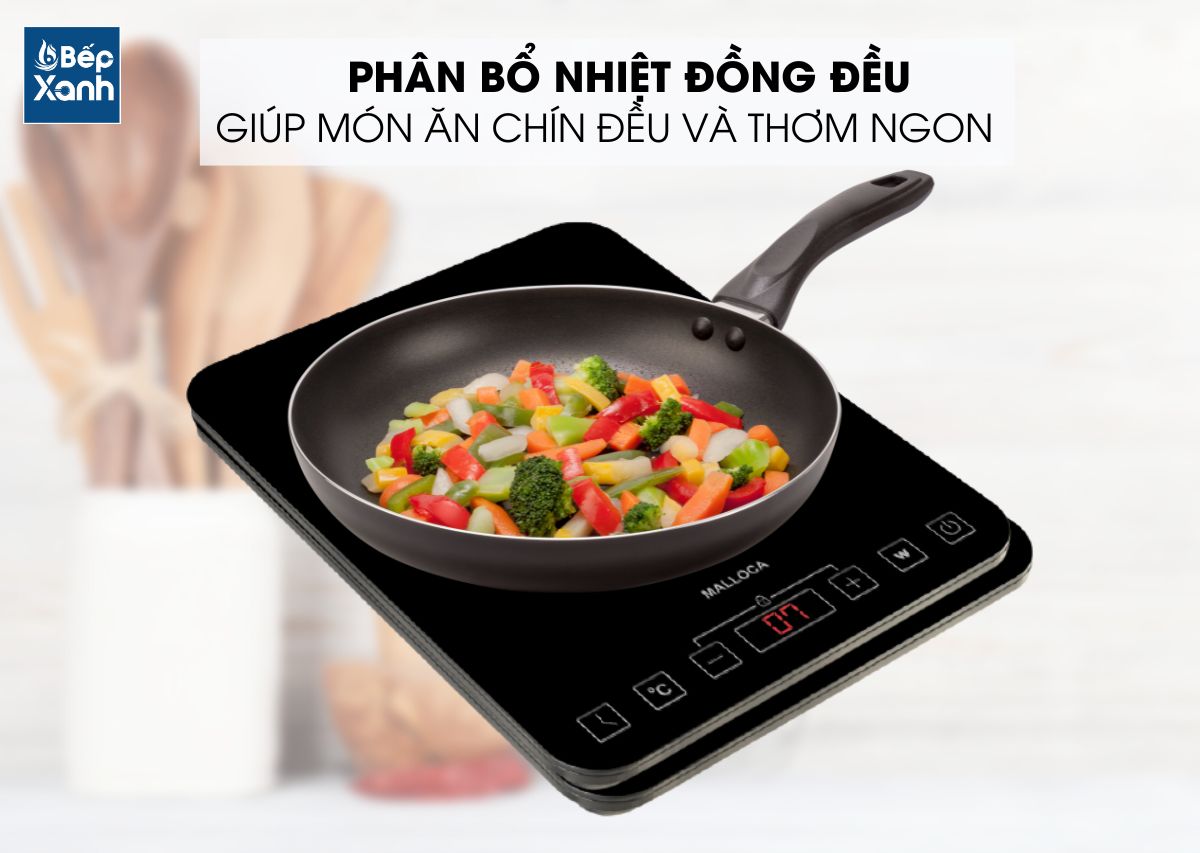 Phân bổ nhiệt đều: Với tính năng tự động nhận diện nồi, bếp sẽ nhận diện khu vực đáy nồi nhằm phân bổ năng lượng, tạo nhiệt lượng đều và đầy đủ. Tính năng nhận diện từ tốt của bếp Malloca được nhiều khách hàng đánh giá cao, giúp món ăn chín đều và ngon hơn.