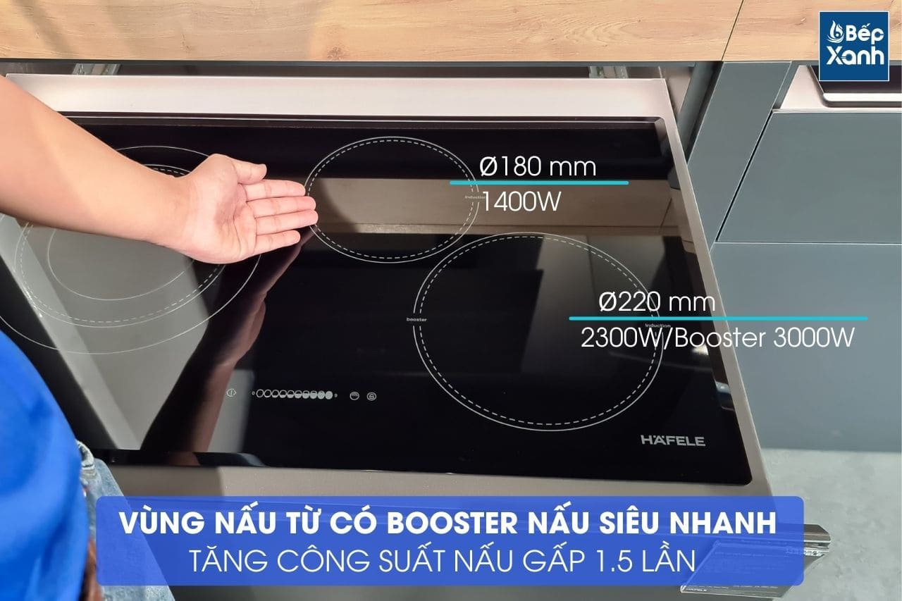 Vùng bếp bên phải là hai vùng nấu từ có công suất cao, đặc biệt vùng từ lớn còn có Booster giúp tăng công suất nấu gấp 1.5 lần so với bình thường, món ăn được nấu nhanh chóng, tiết kiệm thời gian và điện năng tối đa.
