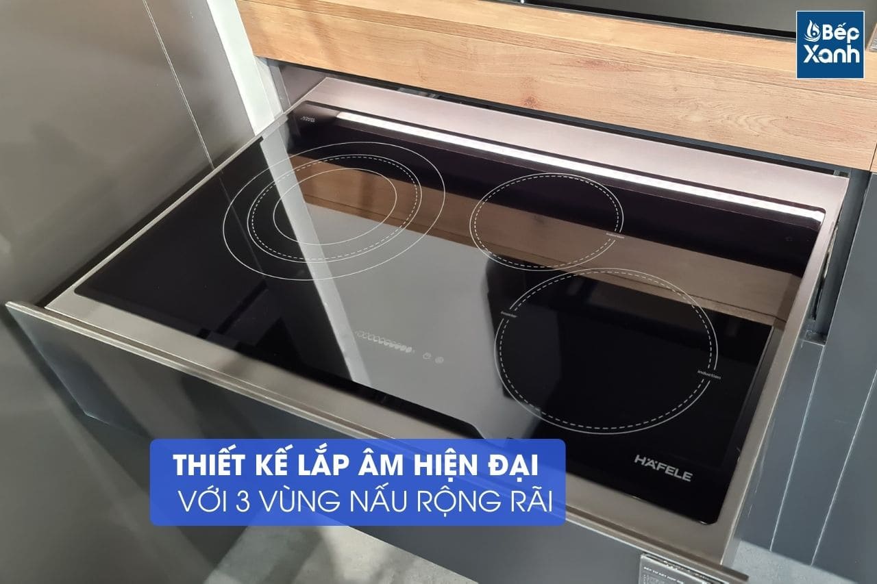 Bếp điện từ Hafele được thiết kế lắp âm hiện đại, kích thước bếp 77 x 45 cm dạng hình chữ nhật có phần bụng bếp được nằm phía dưới gọn gàng, phía trên là mặt kính tăng tính thẩm mỹ cho căn bếp. Ba vùng nấu có khoảng cách phân bổ hợp lý để nấu ăn cùng lúc vô cùng tiện lợi, phù hợp với các gia đình có từ 3 - 4 thành viên.