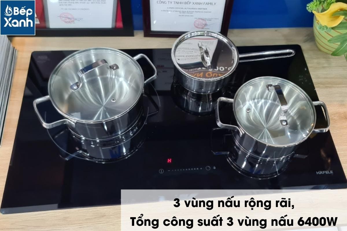 Tổng công suất 3 vùng nấu lên đến 6400W với 9 mức điều chỉnh gia nhiệt. Nhờ vậy, bạn có thể tùy chỉnh nhiệt độ thích hợp với từng món ăn. Bếp được thiết kế với 3 vùng nấu rộng rãi để bạn có thể nấu cùng lúc 3 vùng mà không lo các nồi chạm nhau.