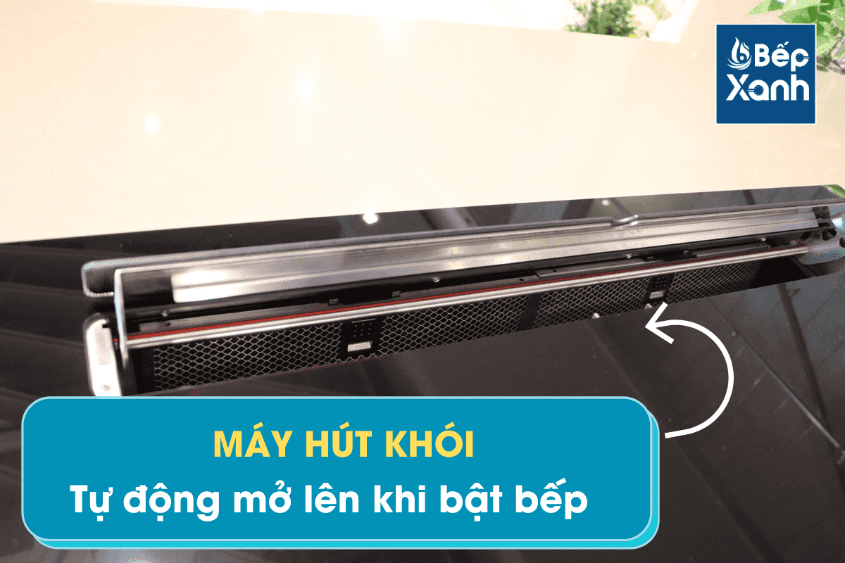 Bình thường, máy hút khói sẽ đóng lại bằng nắp che mặt kính tương đồng với bề mặt bếp. Khi cần sử dụng, nắp che được mở lên với tiết diện hút rộng. Thiết kế này đem lại tính thẩm mỹ cao cho sản phẩm.