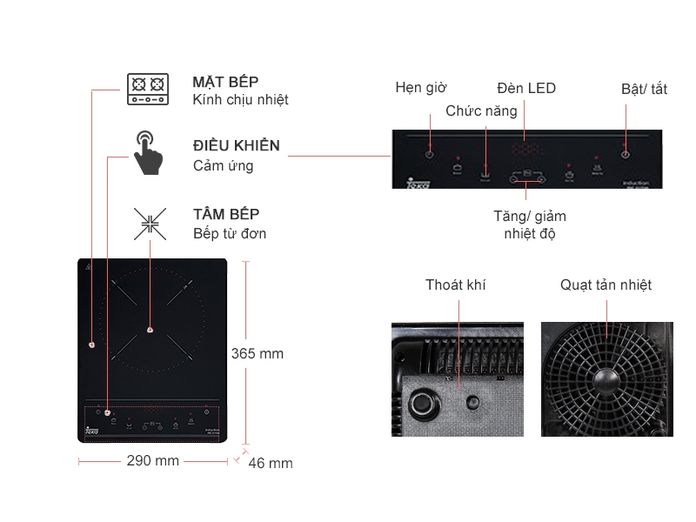 • Chất liệu mặt bếp: kính chịu lực
