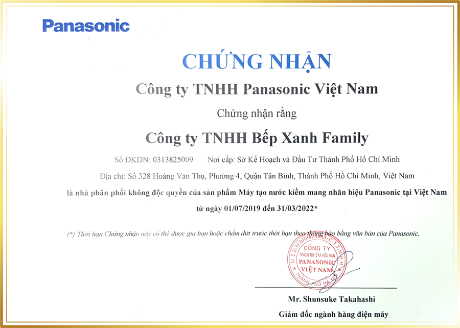 Bếp XANH chính thức được Panasonic Việt Nam công nhận là nhà phân phối chính hãng máy lọc nước điện giải Panasonic tại Việt Nam. Đây chính là sự công nhận cho những nỗ lực của Bếp XANH trong việc cung cấp các sản phẩm máy điện giải Panasonic chính hãng và uy tín cho thị trường.