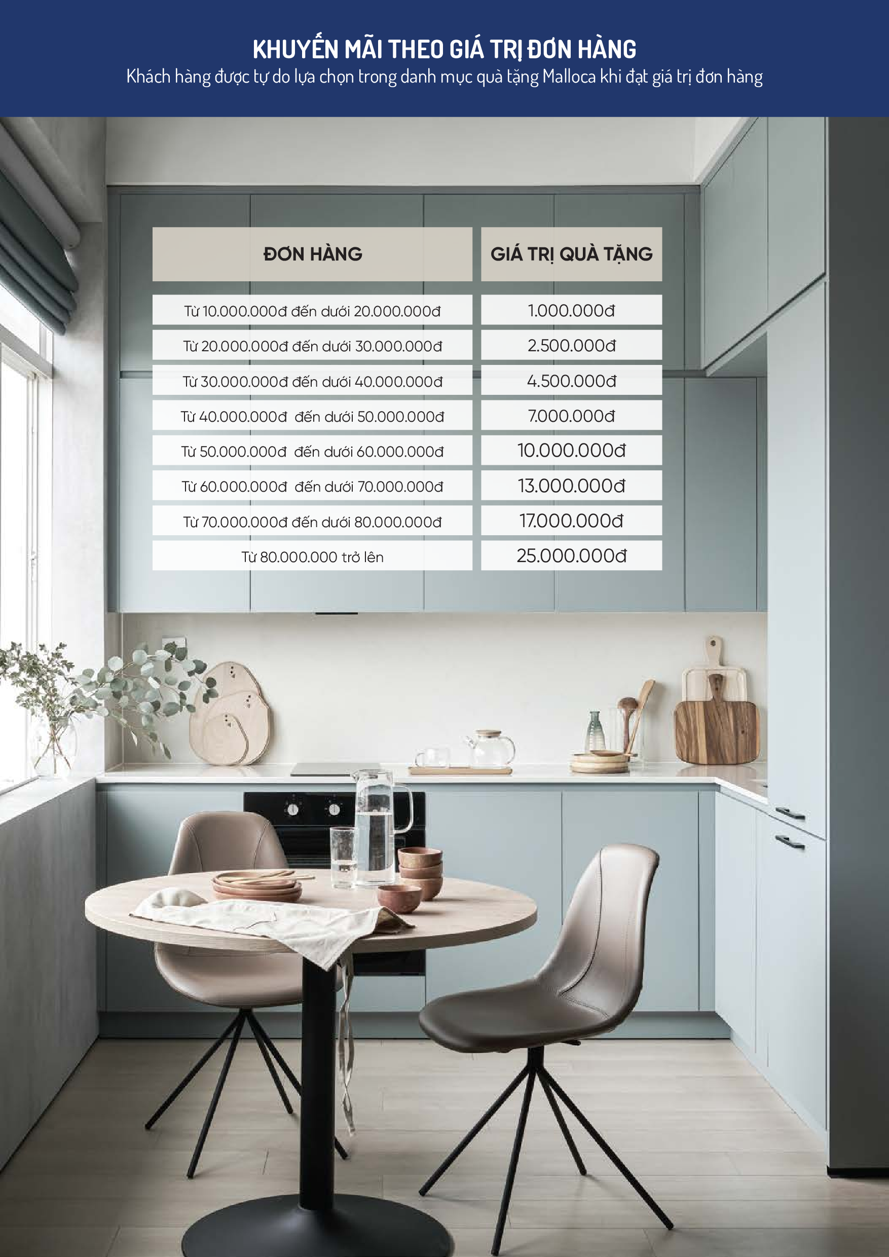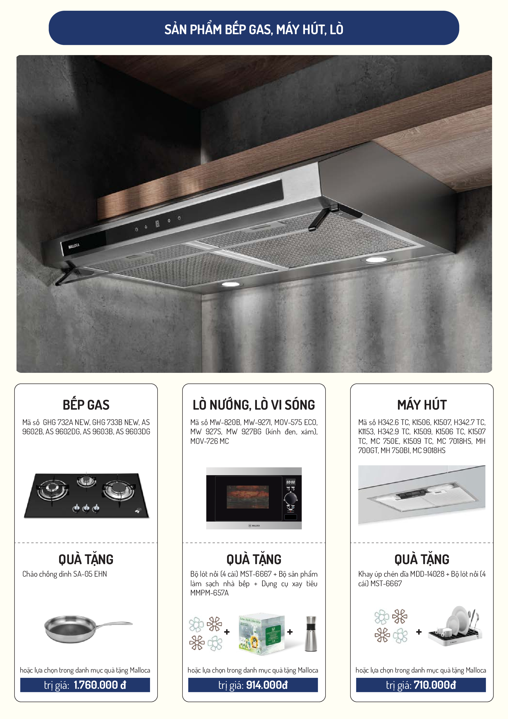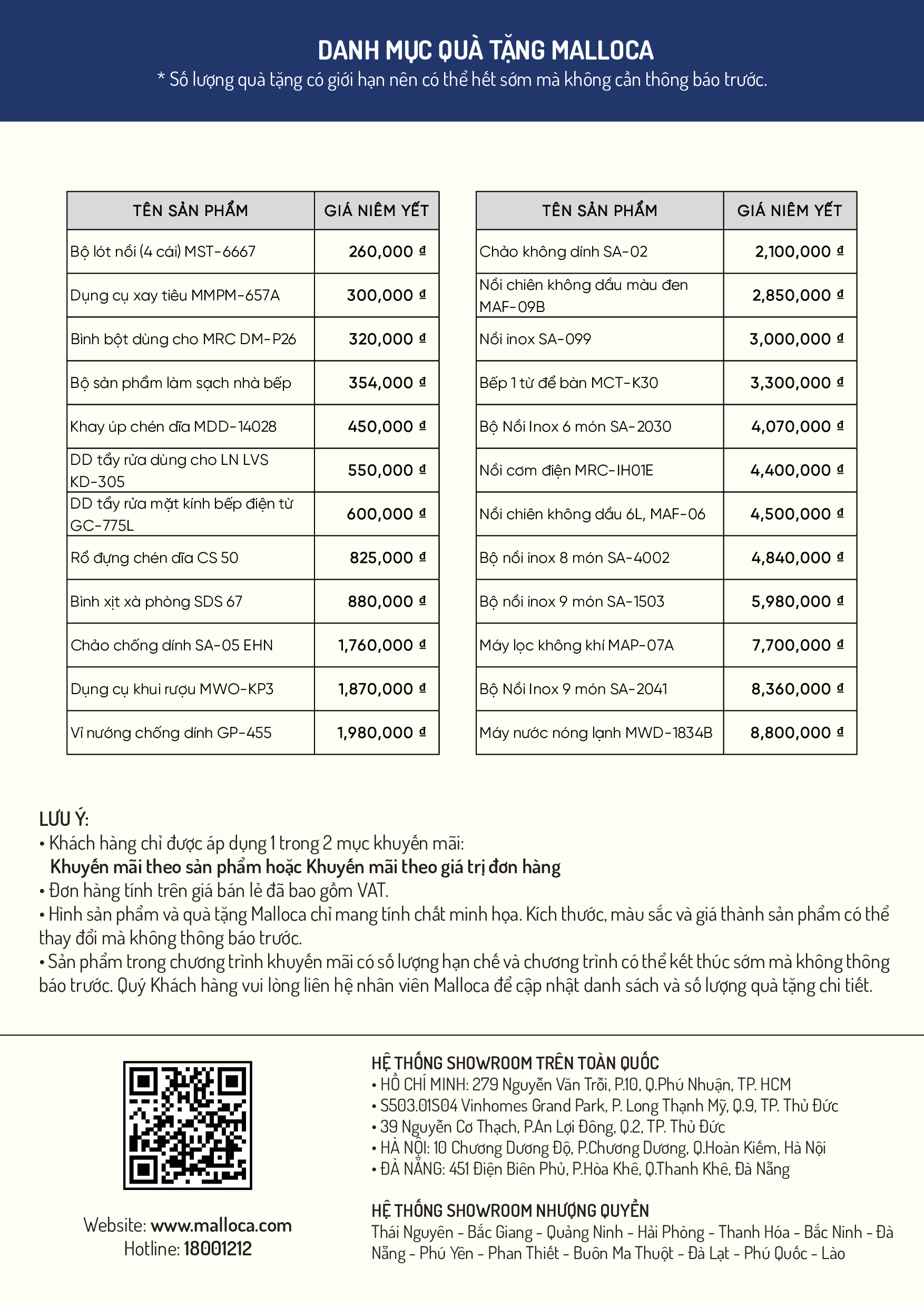 Theo đó, khi mua các sản phẩm của hãng Malloca trong chương trình khuyến mãi, khách hàng sẽ nhận được quà tặng với nhiều trị giá khác nhau. Khách hàng lựa chọn 1 trong 2 mục khuyến mãi A - theo sản phẩm hoặc B - theo giá trị đơn hàng.