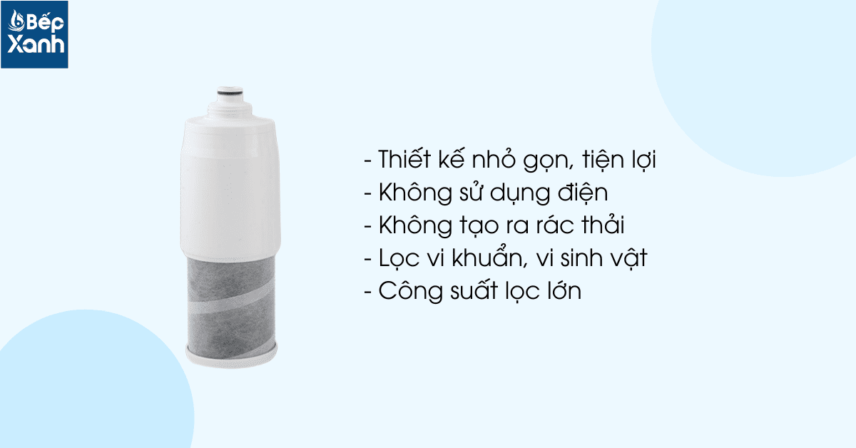 - Bộ lọc không sử dụng điện, khi lọc không tạo ra rác thải, thân thiện với môi trường.