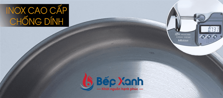 Mặt bên trong của chảo làm bằng inox cao cấp, sáng bóng, không thôi nhiễm độc hại, chống dính nên tha hồ chiên xào các món ăn ngon miệng. Sau khi nấu, dễ dàng dùng miếng bọt biển hoặc chùi nồi mềm làu sạch, lại sáng bóng.
