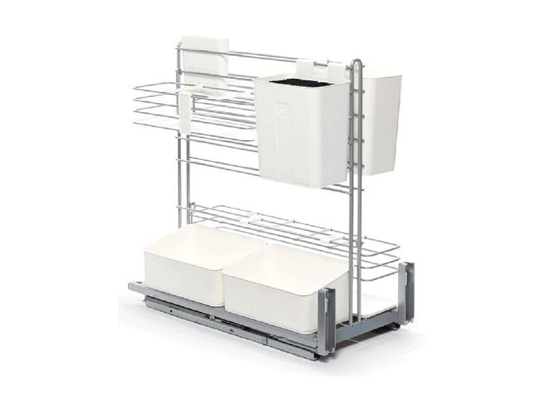 Trọn bộ gồm: Kệ để dao, rổ tháo rời, hộc đựng đũa, khay để dụng cụ, rổ đựng chai lọ, hộc nhựa và ray trượt giảm chấn.