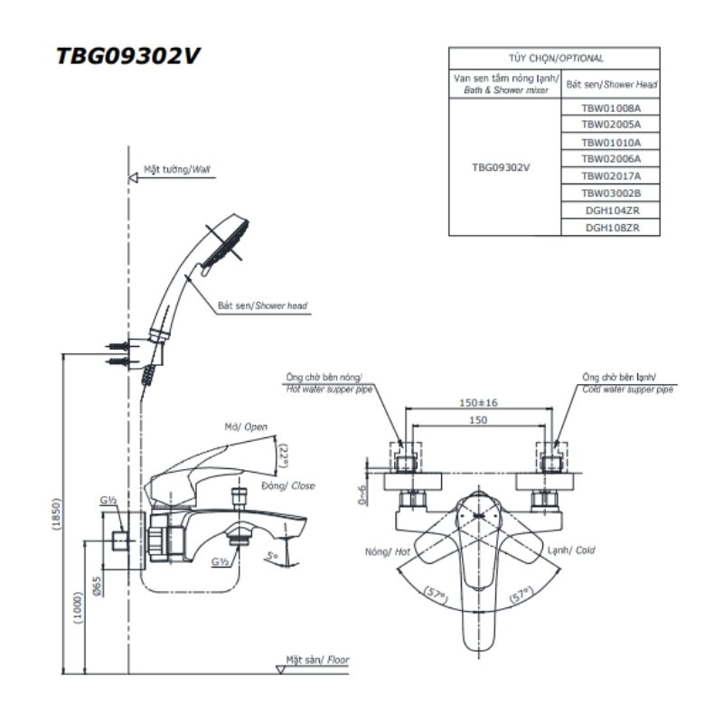 Kích thước Bộ sen tắm nóng lạnh TOTO TBG09302V/TBW02017A