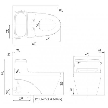 - Kích thước bồn cầu: 809 x 475 x 615 mm (dài x rộng x cao)