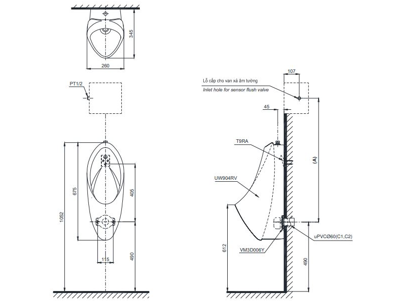 Kích thước bồn tiểu nam treo tường TOTO UT904R