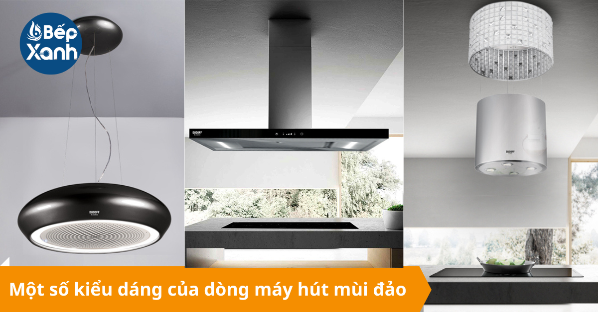 Máy hút mùi đảo thường có kích thước tương đối lớn chiều ngang khoảng 90 cm (một số ít khoảng 70 cm) và có kích thước kiểu dáng độc lạ, đẹp mắt hơn so với các dòng máy hút mùi khác. Nhiều người thường chọn lắp đặt hút mùi bếp đảo cho không gian bởi vì thiết kế độc đáo, có thể trở thành một thiết bị decor cho căn bếp thêm mới lạ, hiện đại, sang trọng hơn. Một số kiểu dáng của dòng máy hút mùi đảo có thể kể đến như máy hút mùi đảo hình vuông, hình tròn, oval, hình trụ, kính cong, chữ T,máy hút mùi đảo đèn,... đem đến không gian đẳng cấp và sang trọng cho gia chủ.