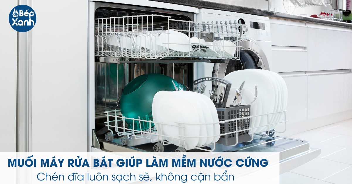Như đã biết muối máy rửa bát hay còn gọi là muối làm mềm nước là sản phẩm chuyên dụng cho máy rửa chén. Muối máy rửa bát có vai trò làm mềm nước cứng, làm giảm sự tích tụ của cặn bẩn trong quá trình rửa, nhờ đó chén đĩa luôn sạch sẽ, sáng bóng, tăng độ bền cho máy.