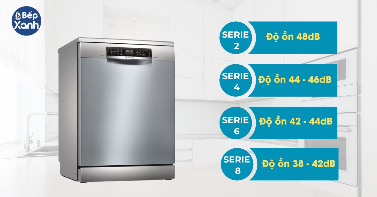 Độ ồn của máy rửa bát Bosch trong dòng serie 2 thường là 48dB, mức độ ồn mà chúng ta thường gặp. Tuy nhiên, khi chuyển sang dòng máy rửa chén Bosch serie 4, độ ồn đã giảm xuống khoảng 44-46dB. Dòng serie 6 phổ biến với mức độ ồn từ 42-44dB và dòng serie 8 là tốt nhất, có những mẫu chỉ từ 38-42dB. Với mức độ ồn này, máy rửa chén bát Bosch hoạt động cực yên tĩnh, được đánh giá là nhà cung cấp máy rửa bát yên tĩnh nhất trên thị trường, vượt trội hơn cả Miele.