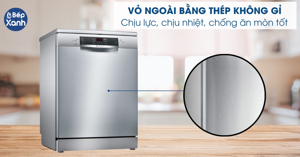 - Cấu tạo vỏ bên ngoài thép không gỉ: Tất cả các dòng máy rửa chén Bosch đều có thiết kế vỏ bên ngoài bằng thép không gỉ. Vật liệu này không chỉ tạo nên vẻ ngoài sang trọng và bền bỉ, mà còn đảm bảo khả năng chống ăn mòn và dễ dàng vệ sinh.
