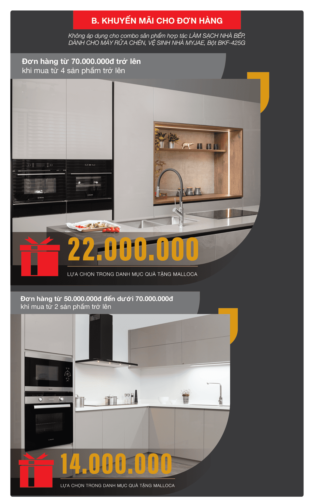 Theo đó, khi mua máy hút mùi, bếp điện từ, lò nướng, chậu rửa chén,...cùng các sản phẩm khác trong danh mục khuyến mãi, khách hàng sẽ nhận được quà tặng với nhiều trị giá khác nhau. Khách hàng lựa chọn 1 trong 2 mục khuyến mãi A- theo sản phẩm hoặc B-theo đơn hàng.