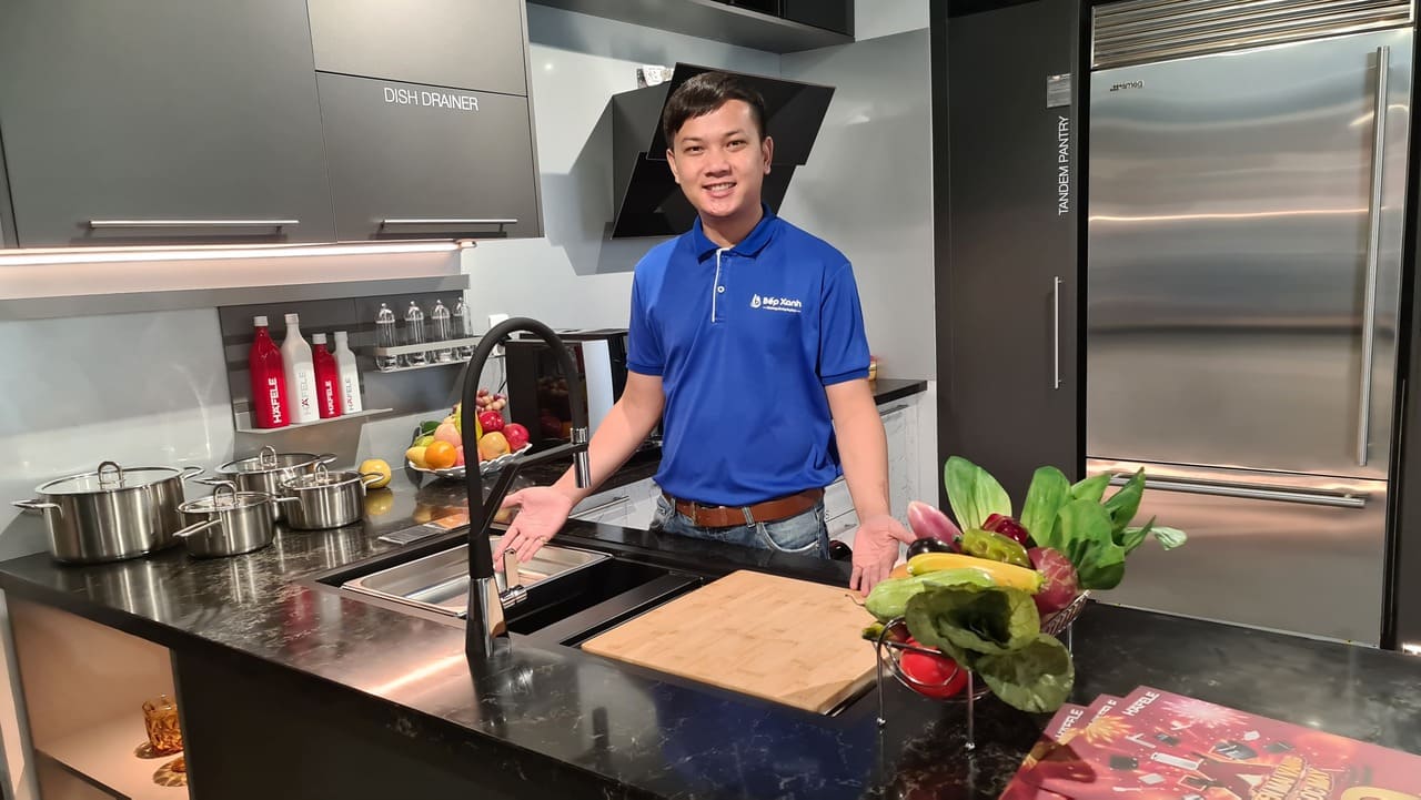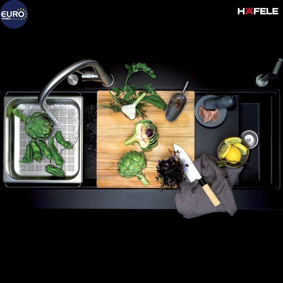 Đáp ứng đa dạng cho sở thích và điều kiện không gian bếp cho từng gia đình, Hafele đem đến cho chậu đá khả năng lắp đặp đa dạng bao gồm: lắp nổi / lắp âm / lắp bằng. Hình ảnh bên dưới là kiểu lắp bằng với bề mặt bếp, rất đẹp và sang trọng.