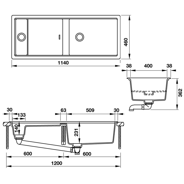 Chậu có kích thước chiều dài 1140mm, chiều rộng 460mm, chia làm 3 khu vực riêng biệt là ngăn rửa lớn, bàn chờ (bàn chuẩn bị) và ngăn rửa nhỏ.