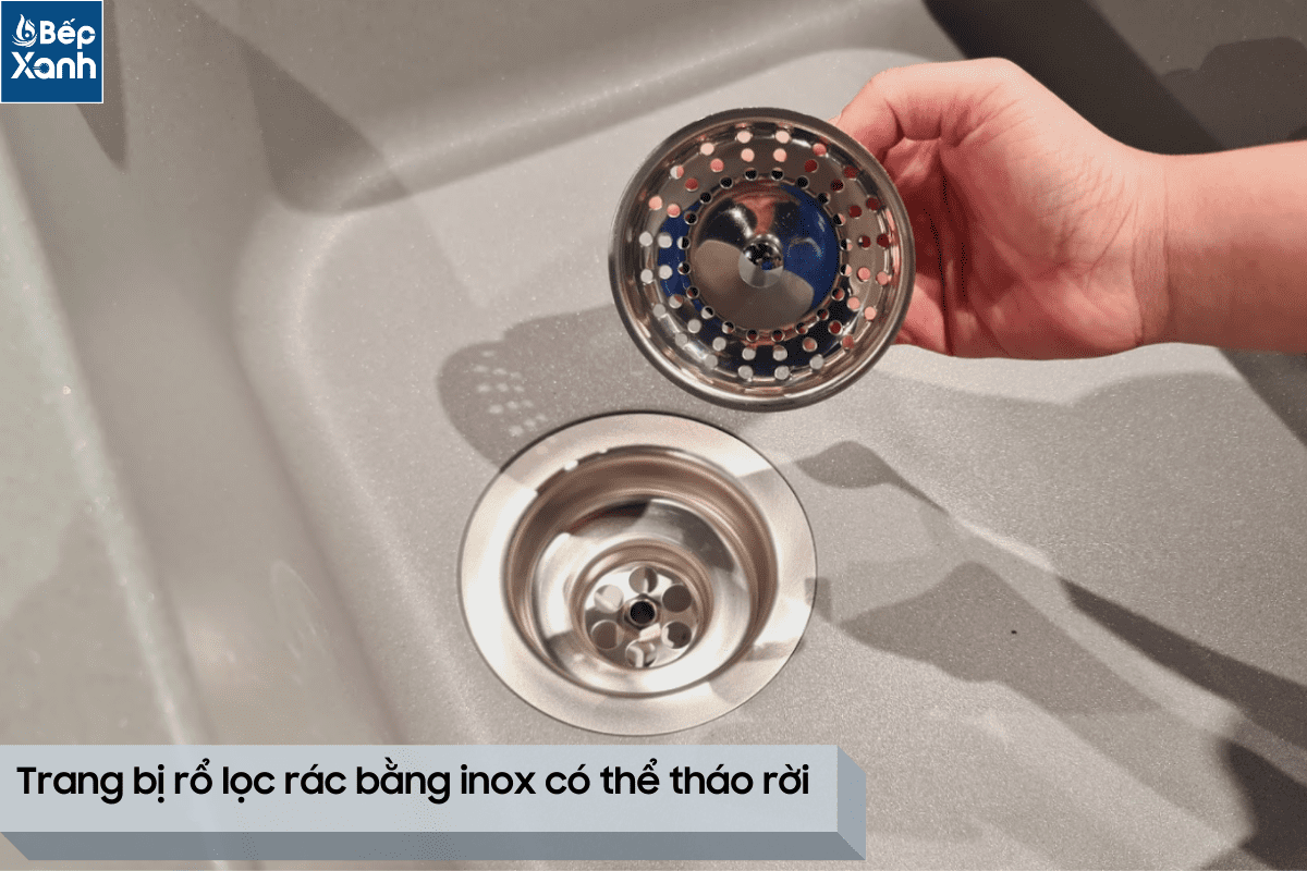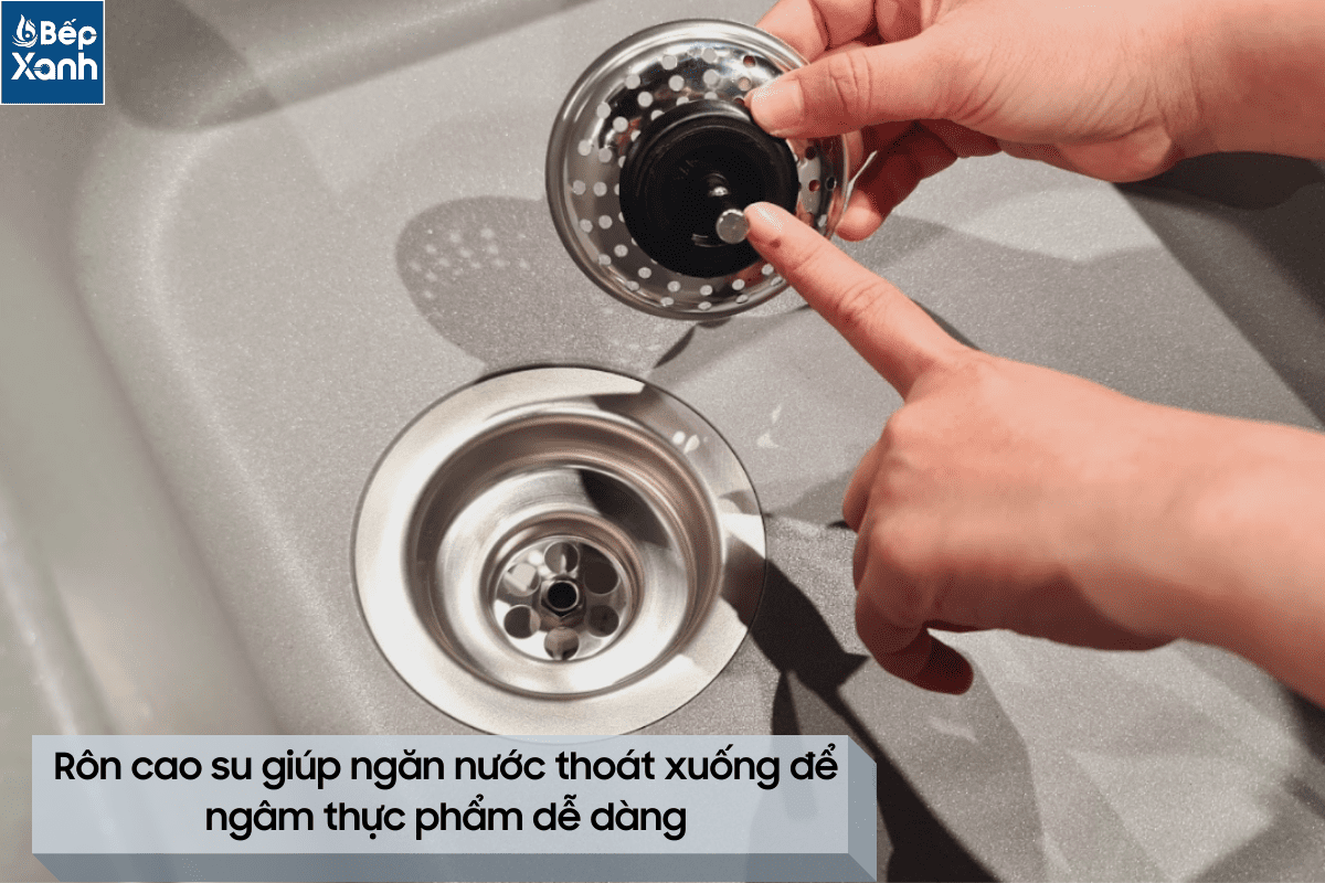 Bên dưới rổ lọc rác được trang bị rôn cao su để bạn có thể ngâm thực phẩm tiện lợi. Khi cần ngâm rửa thực phẩm thì chỉ cần nhấn nhẹ rổ lọc rác xuống thì phần rôn cao su sẽ ngăn nước thoát xuống.