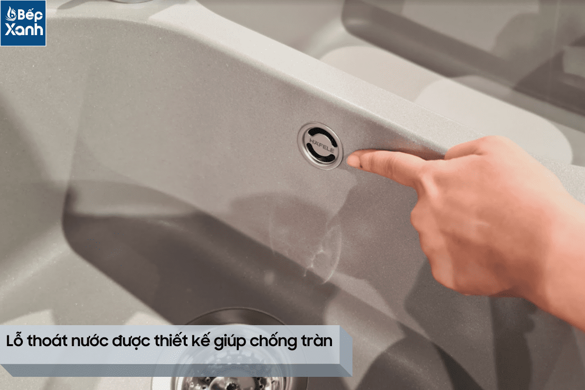 Chậu rửa chén Hafele luôn được trang bị lỗ thoát nước bên thành chậu giúp nước thoát xuống dễ dàng khi bị dâng nước.