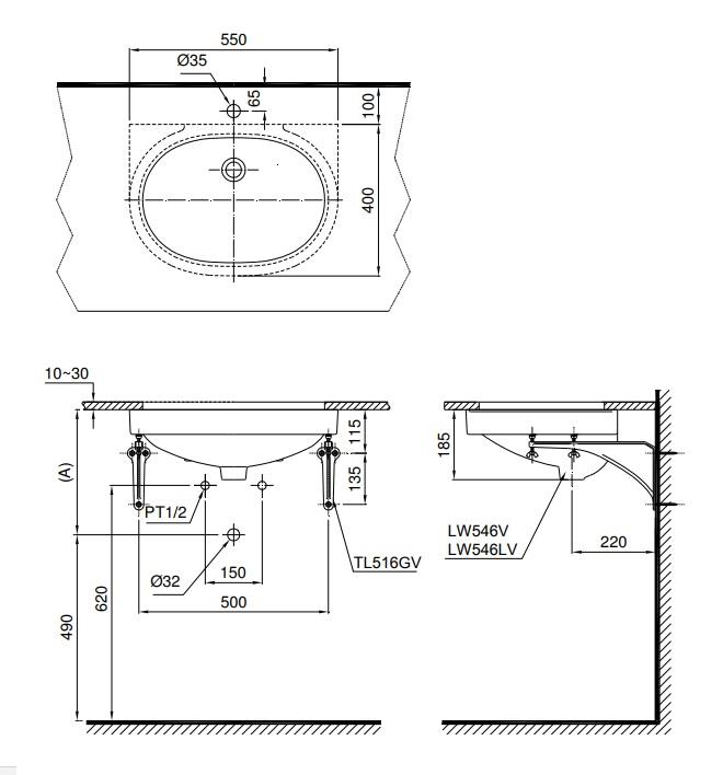 Kích thước lắp đặt chậu rửa âm bàn TOTO LT546