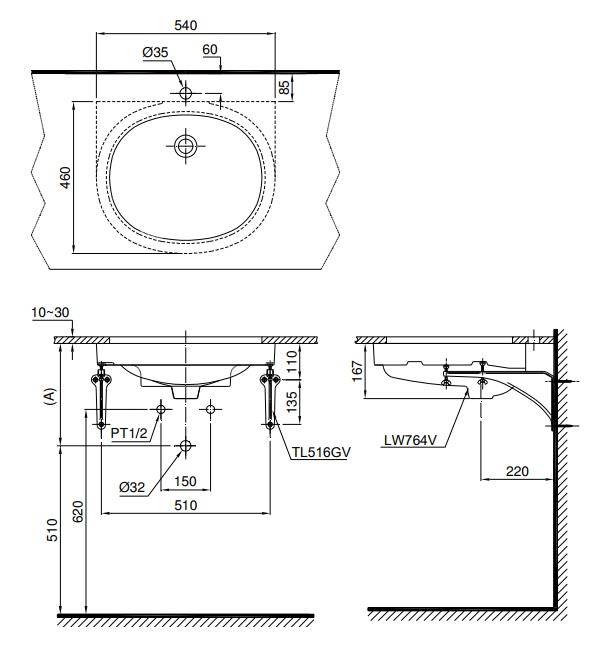 Kích thước lắp đặt chậu rửa âm bàn TOTO LT764