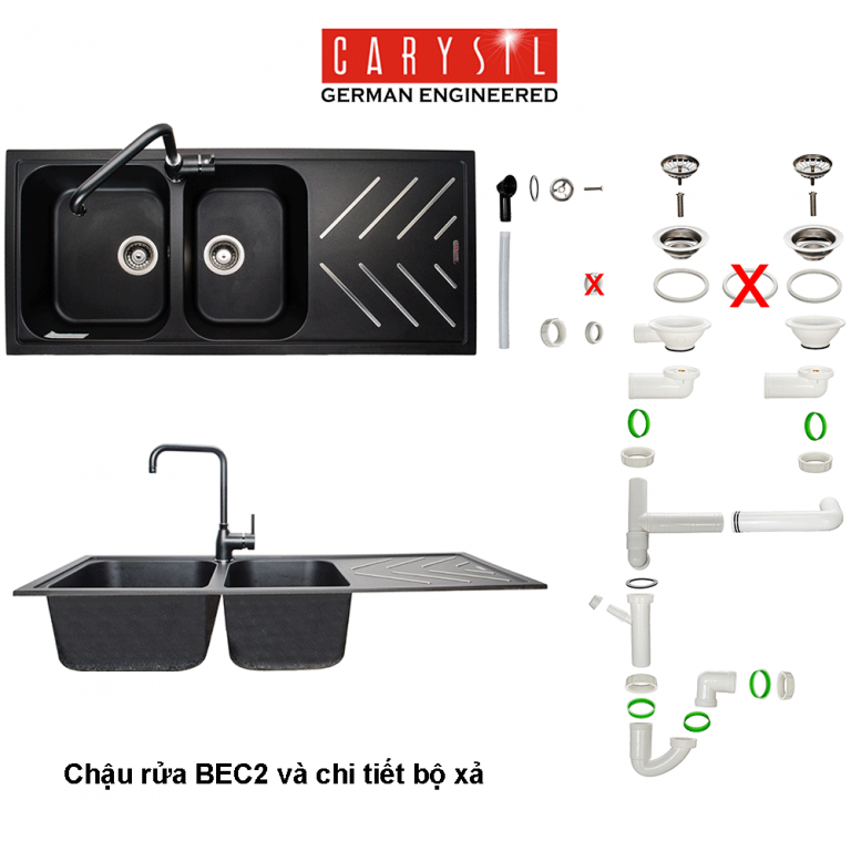 Chậu rửa chén bằng đá Granite BEC2 của Carysil đã bao gồm đầy đủ bộ xả (xiphong) phía dưới. Khách hàng sẽ không phải lo lắng mua thêm bộ xả khi mua mới chậu.