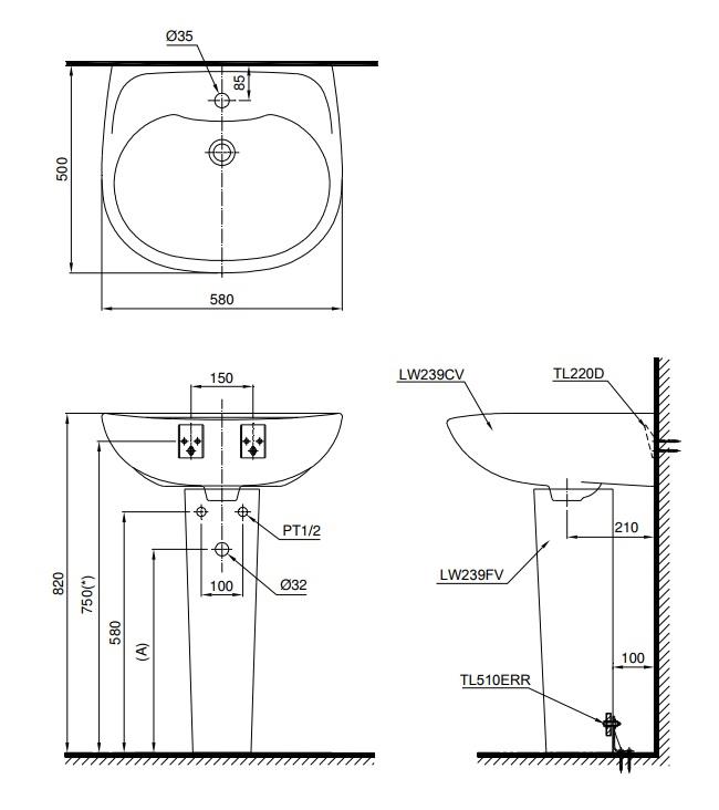 Kích thước lắp đặt chậu rửa chân dài TOTO LPT239CR