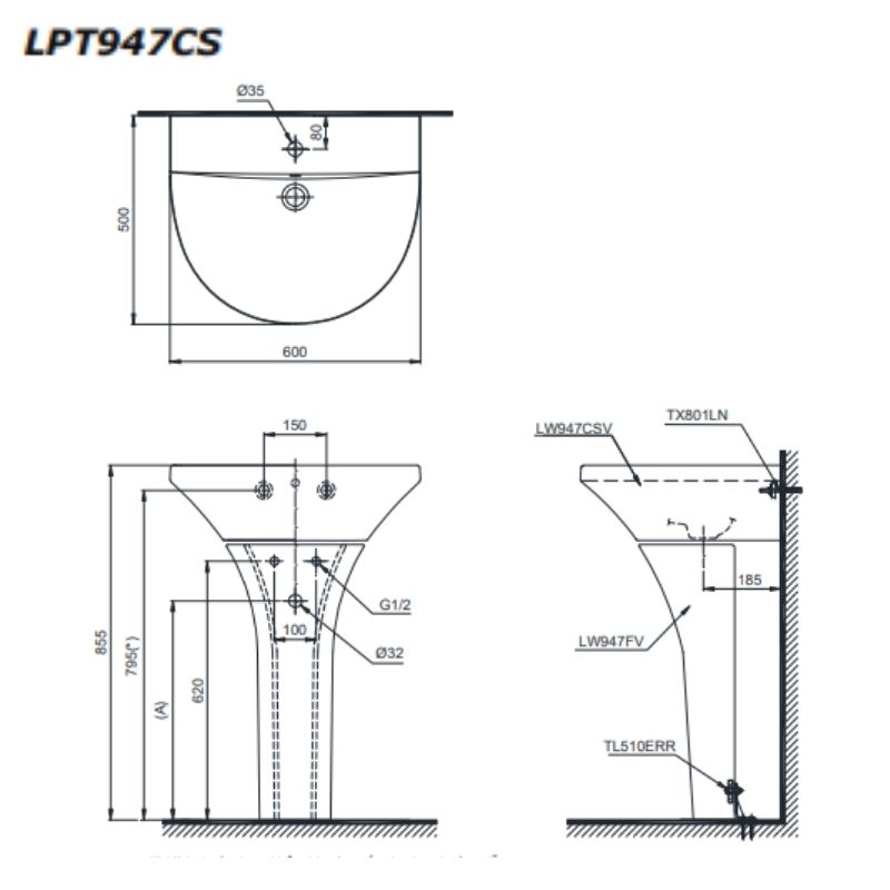 Kích thước lắp đặt chậu rửa chân dài TOTO LPT947CS