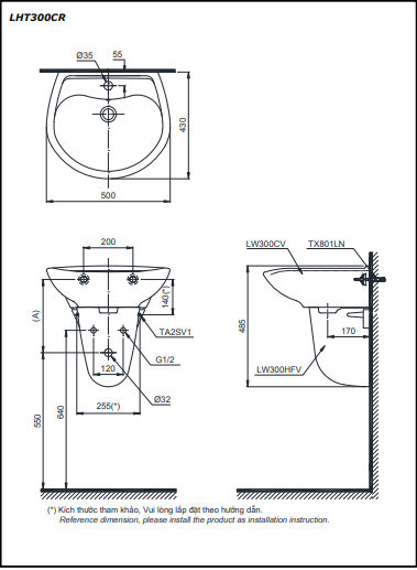 Kích thước lắp đặt chậu rửa chân lửng TOTO LHT300CR/LHT300CM/LHT300CRM