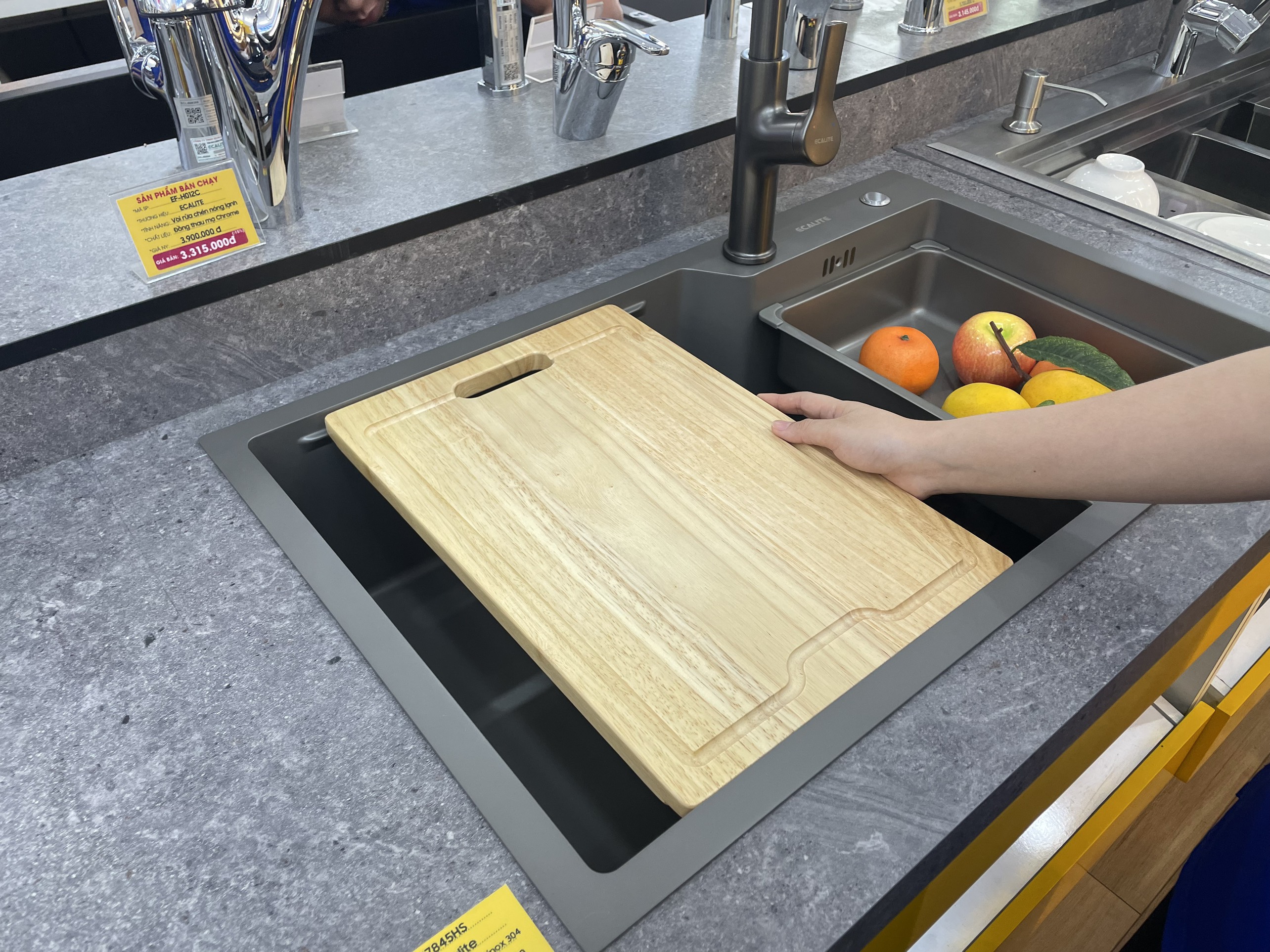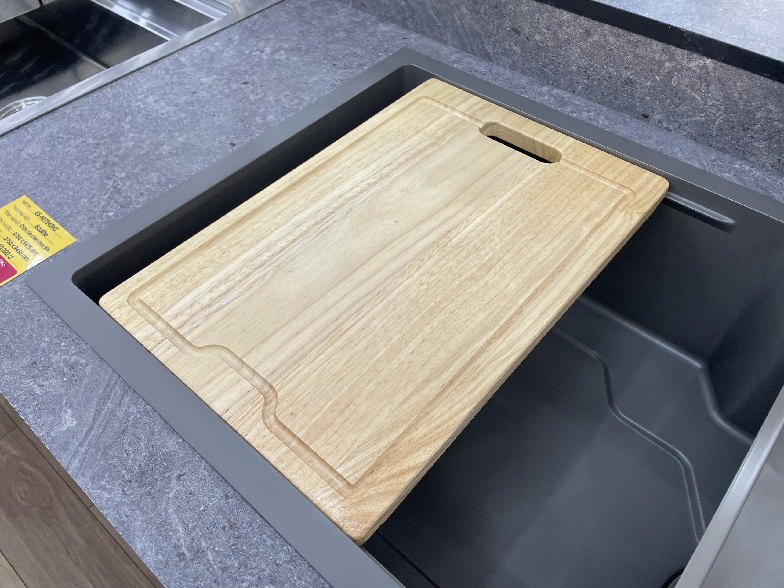 Thớt gỗ có thể kéo trượt trên thành chậu, giúp bạn dễ dàng vệ sinh cũng như sử dụng hàng ngày.
