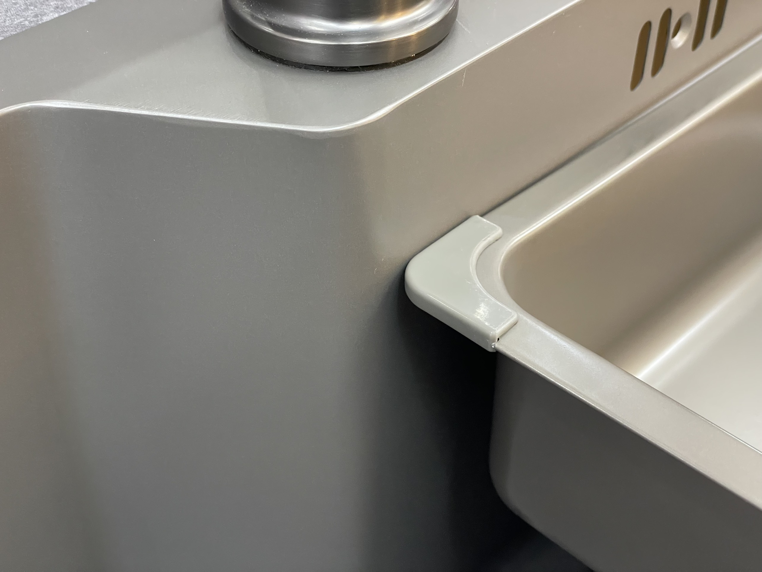 Điểm nhấn ở thành chậu cũng như tổng thể chậu rửa nằm ở thiết kế bo góc đẹp mắt ở 4 góc. Thiết kế này không chỉ mang tính thẩm mỹ cao mà còn giúp các thực phẩm, đồ dùng trong quá trình rửa được giữ lại trong hộc rửa không bị rơi ra ngoài.