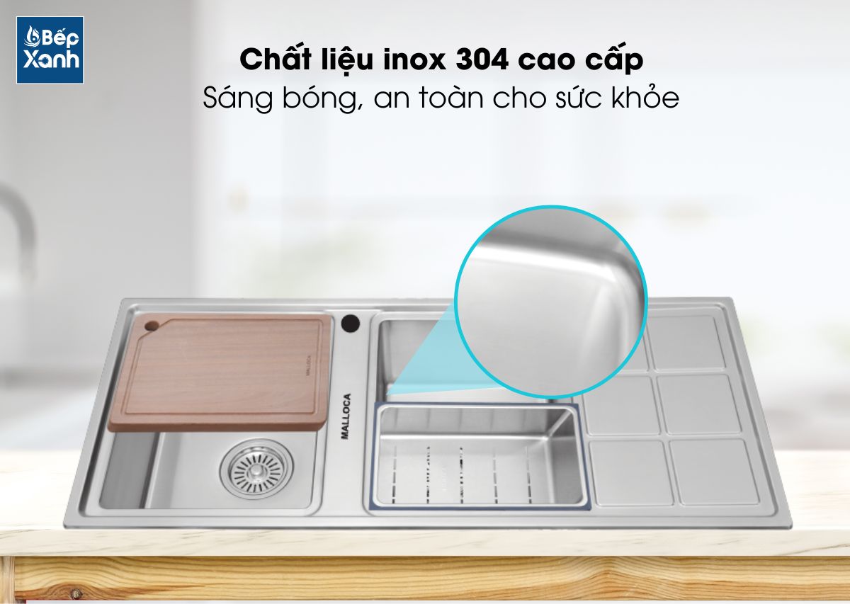 Là một trong những chất liệu hàng đầu ứng dụng trong ngành thiết bị nhà bếp, chất liệu Inox 304 mang đến độ bền vượt trội cùng độ bóng sáng theo thời gian mà ít có chất liệu nào có được. Bạn sẽ hoàn toàn yên tâm sử dụng sản phẩm trong thời gian dài mà không lo đến việc chậu bị ăn mòn hay bị gỉ sét. Bên cạnh đó còn giữ được độ sáng bóng tự nhiên của sản phẩm và đảm bảo an toàn sức khỏe cho cả gia đình bạn.