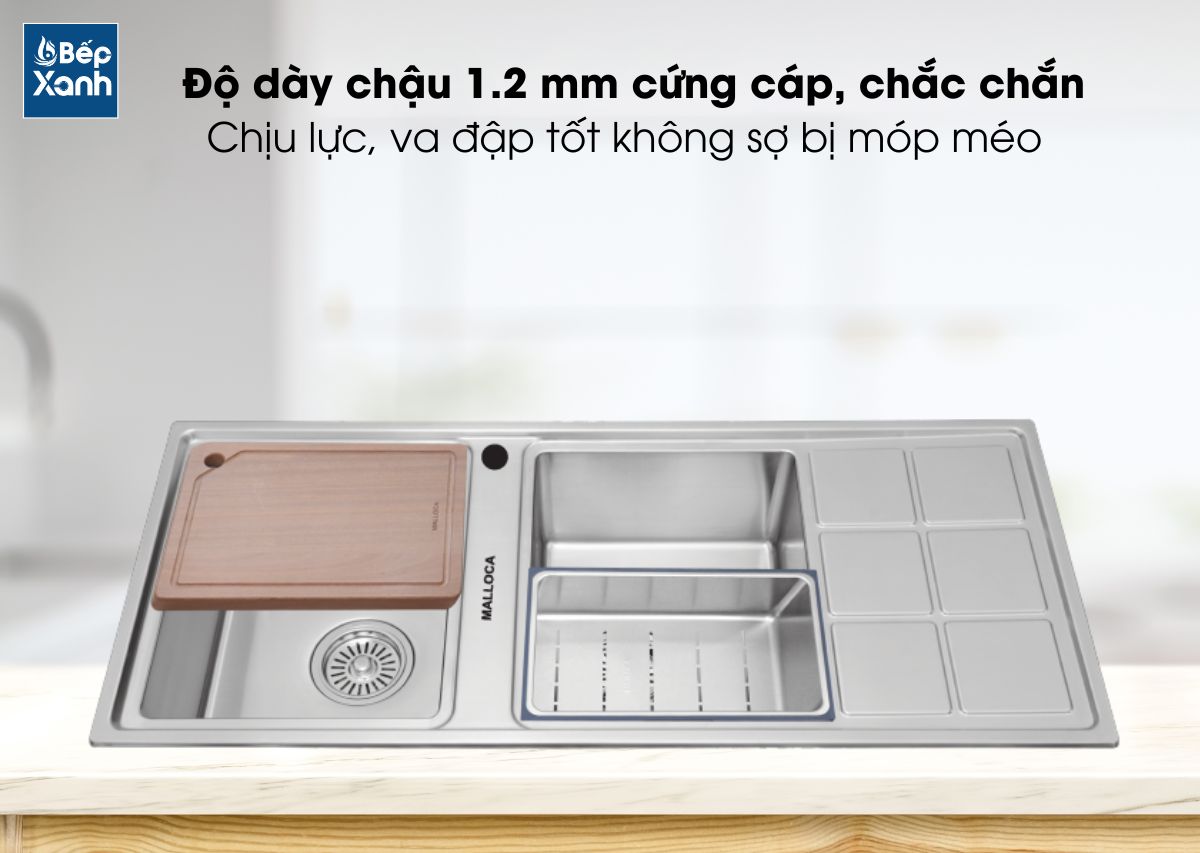 Chậu rửa Malooca MS 8815R có độ dày 1.2mm nên rất chắc chắn và cứng cáp, nhờ đó giúp chậu chịu được lực va đập tốt, không sợ bị móp méo. Song song đó với độ dày này chậu còn giúp giảm thiểu được tiếng ồn khi mở nước, mang lại cảm giác nhẹ nhàng yên tĩnh cho bạn.