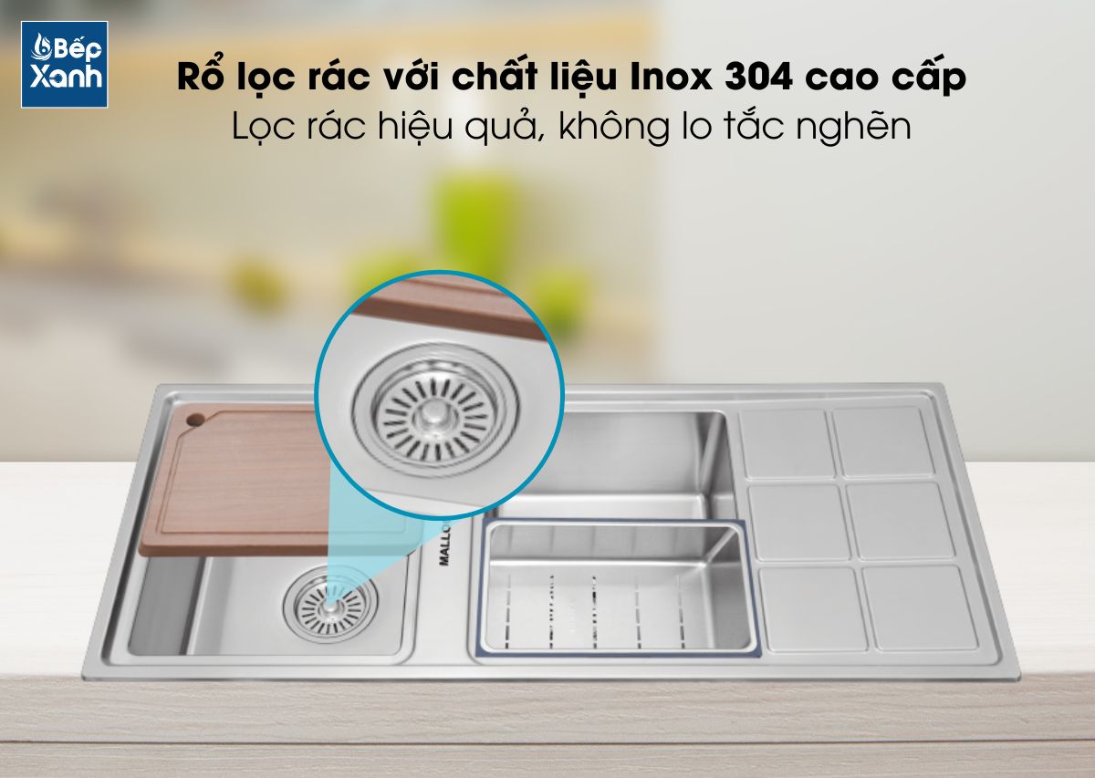 - Rổ lọc rác bằng inox giữ rác hiệu quả, lưu thông nước tốt.