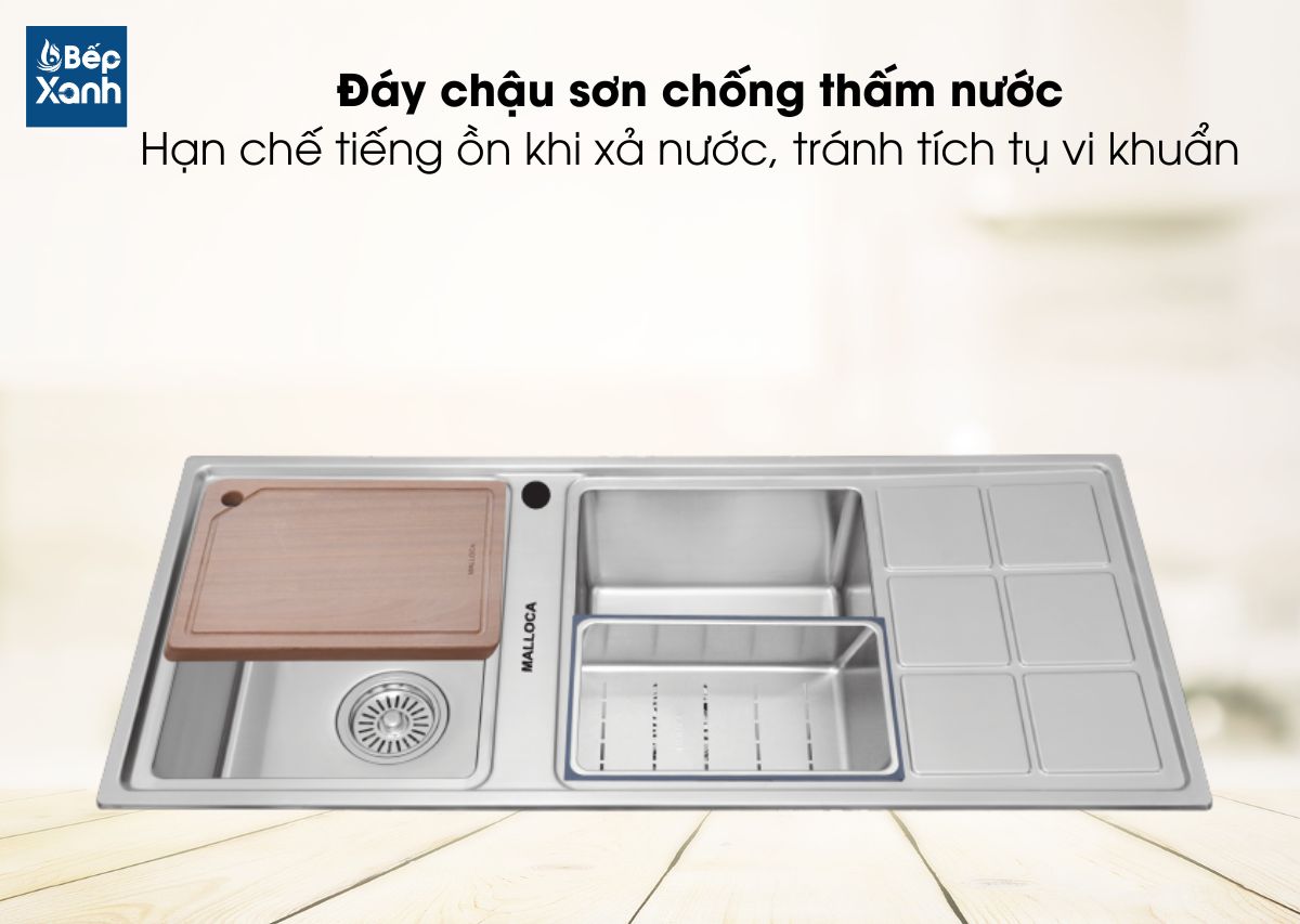 Bên cạnh những tiện ích trên thì phía dưới đáy chậu rửa chén inox Malloca còn được trang bị thêm lớp sơn chống thấm nước trong mỗi lần sử dụng vô cùng hữu ích. Ngoài ra, lớp sơn còn có thể chống ồn hiệu quả, giúp giảm âm thanh xả xuống bồn rửa một cách tối thiểu.