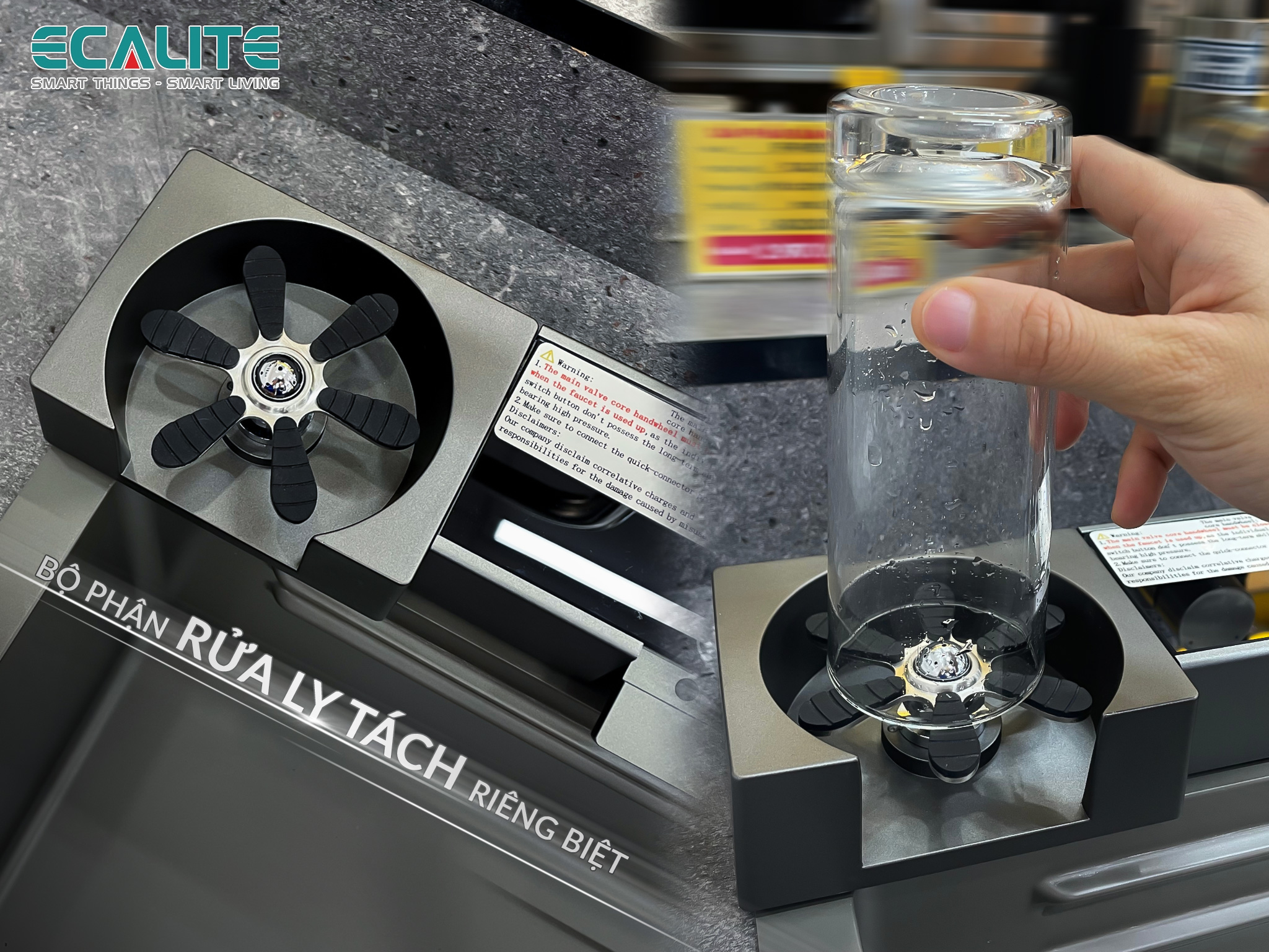 Ngay trên thành chậu là bộ phận được thiết kế riêng để rửa ly tách. Bạn chỉ cần đặt úp ly cần rửa lên bàn xoay, sau đó ấn nhẹ ly xuống là nước sẽ tự phun lên để làm sạch lòng ly, còn nước thừa sẽ tự động thoát xuống lòng chậu. Chỉ với một thao tác đơn giản là ly tách đã được rửa sạch rất tiện lợi.