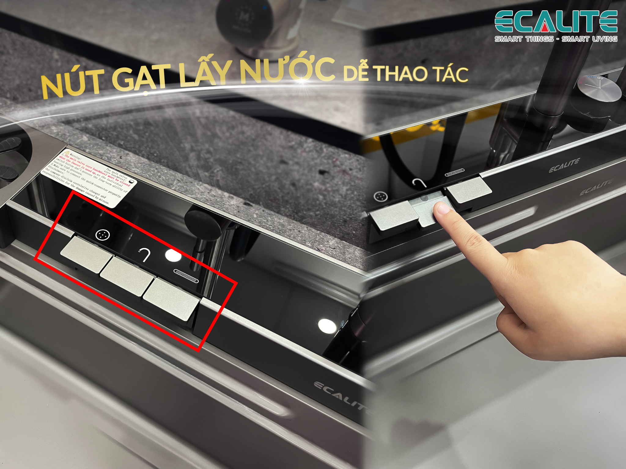 Trên thành chậu rửa chén Ecalite ES-N2310WF-S có 3 nút gạt chọn đường nước thiết kế rất hiện đại, êm tay và dễ dàng thao tác. Từ trái qua phải là bật nước chỗ rửa ly, bật nước vòi rửa bát chính và bật nước khu vực thác nước bên phải. Khi cần dùng nguồn nước nào bạn ấn nhẹ nút tương ứng, khi muốn tắt nước đẩy nhẹ lên là được.