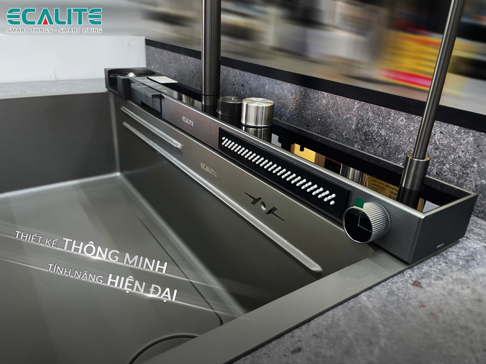 Tiếp nối xu hướng chậu rửa chén thông minh trên thị trường hiện nay, chậu ES-N2310WF-S được hãng Ecalite thiết kế với kết cấu độc đáo và đầy tính hiện đại. Tổng thể chậu là tông màu xám sang trọng, phù hợp đặt ở mọi không gian bếp khác nhau. Điểm nhấn đặc trưng là thành trên của chậu được lắp sẵn đầy đủ các phụ kiện cùng các nút nhấn lấy nước thông minh, kết hợp dải đèn LED chạy dài trên thành tạo nên tổng thể bắt mắt và thu hút.