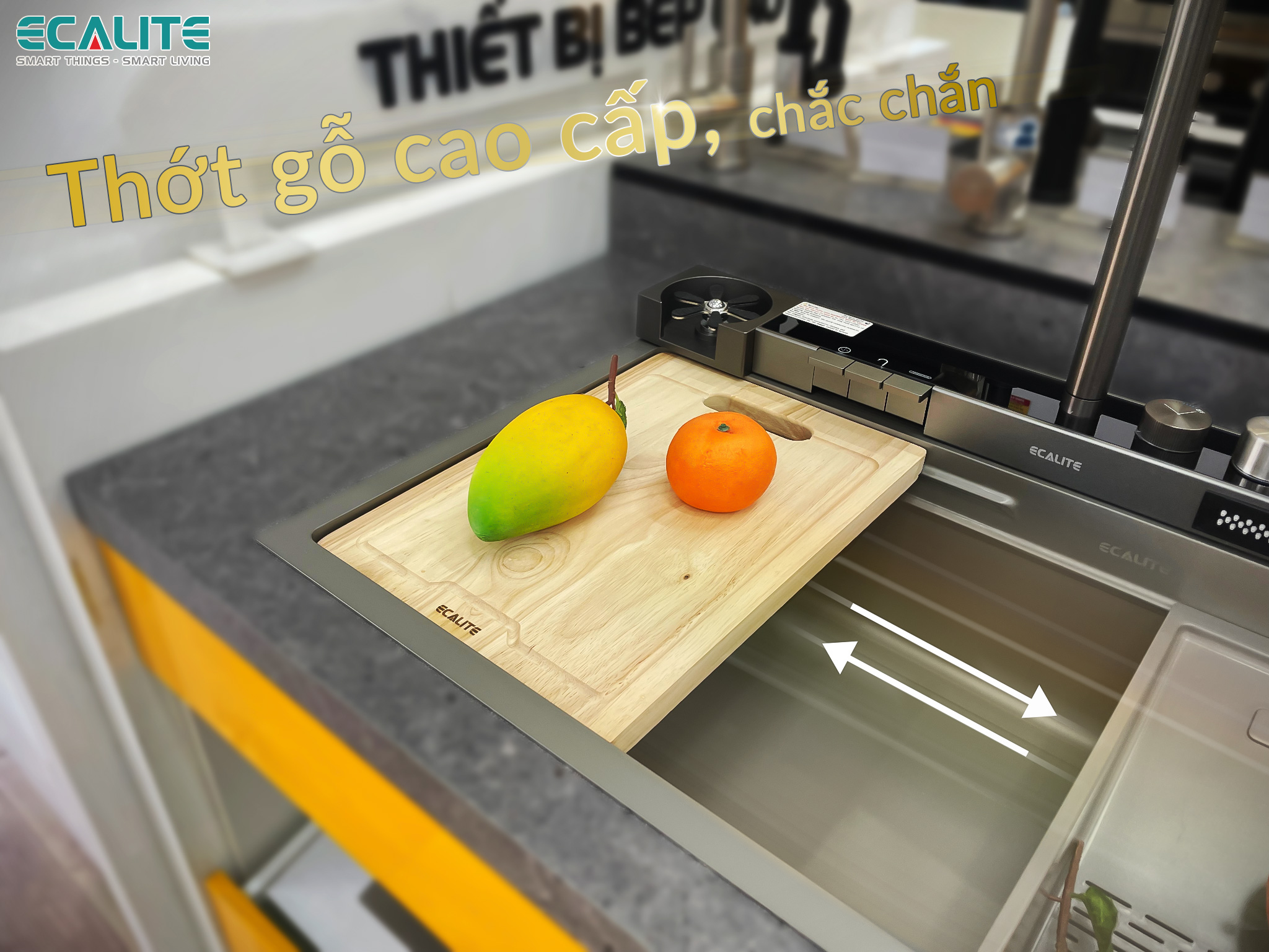 Chậu rửa bát Ecalite ES-N2310WF-S còn có thớt gỗ đi kèm. Thớt thiết kế dạng hình chữ nhật, có quai cầm, rất dày dặn. Trong lòng chậu có sẵn gờ để bạn đặt thớt lên sơ chế thực phẩm ngay tại chậu, vì thế không gian bếp trong nhà sẽ được tối ưu hơn bao giờ hết.