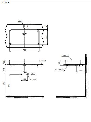 Kích thước lắp đặt chậu rửa đặt bàn TOTO LT953