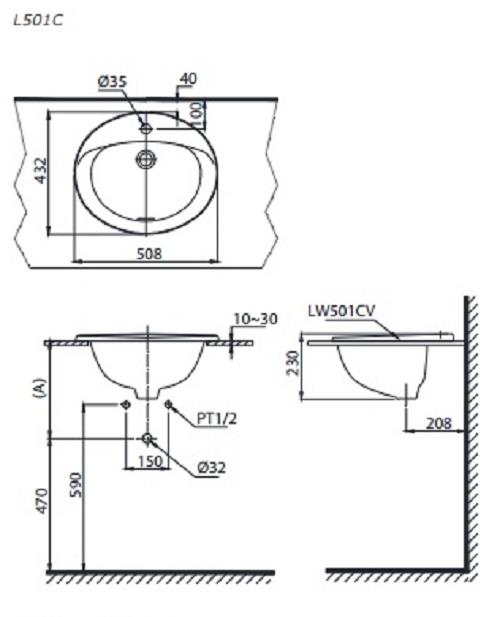 Kích thước chậu rửa dương vành TOTO L501C#W :