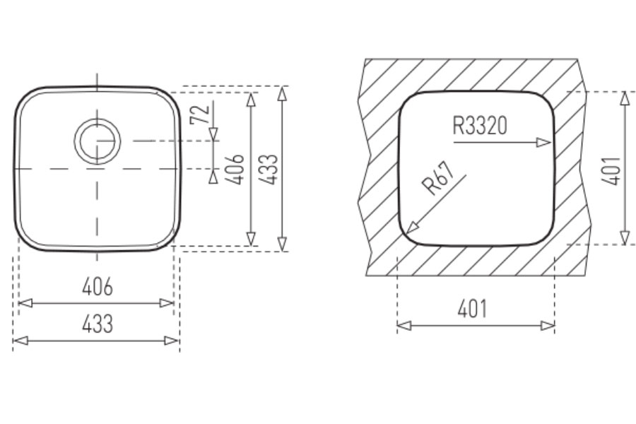 Lắp đặt: Lắp âm Kích thước bề mặt (D/R/S): 433 x 433 x 180 mm Giới hạn hộc tủ dưới: > 45 cm Chất liệu Inox AISI 304 Phụ kiện theo kèm: Bộ xả 3 1/2 và xả tràn |