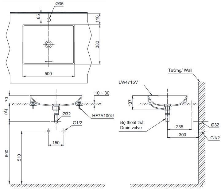 Kích thước lắp đặt chậu rửa đặt bàn TOTO LT4715G19