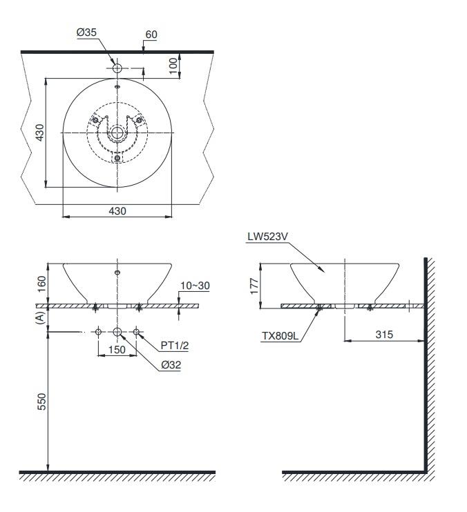 Kích thước lắp đặt chậu đặt bàn TOTO LT523S