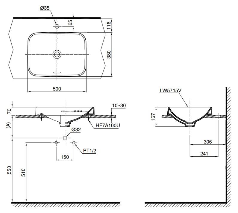 Kích thước lắp đặt chậu rửa đặt bàn TOTO LT5715