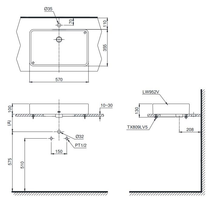 Kích thước lắp đặt chậu rửa đặt bàn TOTO LT952