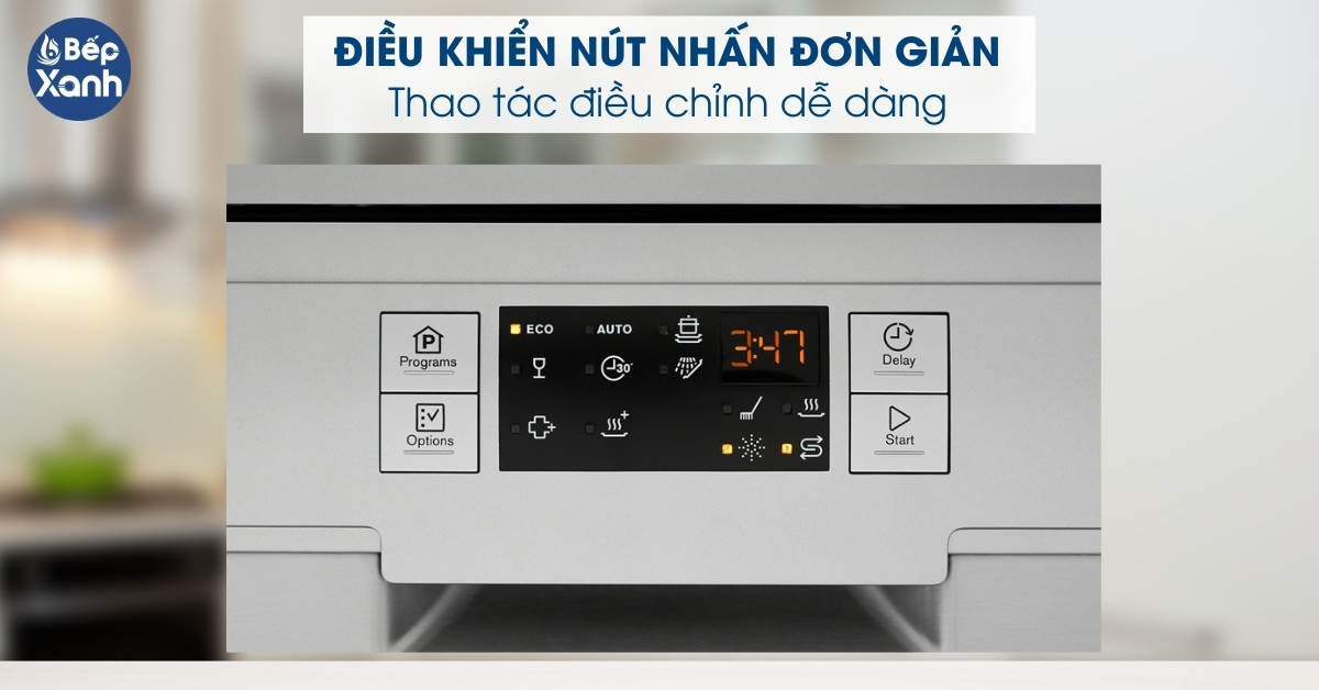Máy rửa chén này sử dụng bảng điều khiển nút nhấn điện tử với các ký hiệu rõ ràng, mang đến sự thuận tiện và dễ sử dụng cho cả những người lớn tuổi. Các ký hiệu trên bảng điều khiển được đặt theo cách tổ chức logic, dễ hiểu và trực quan. Chúng được thiết kế với kích cỡ và hình dạng dễ nhìn, giúp người dùng nhận biết và sử dụng chúng một cách thuận tiện. Bằng cách đơn giản nhấn vào các nút nhấn, người dùng có thể chọn chế độ rửa, điều chỉnh các chức năng và các tùy chọn khác một cách dễ dàng.