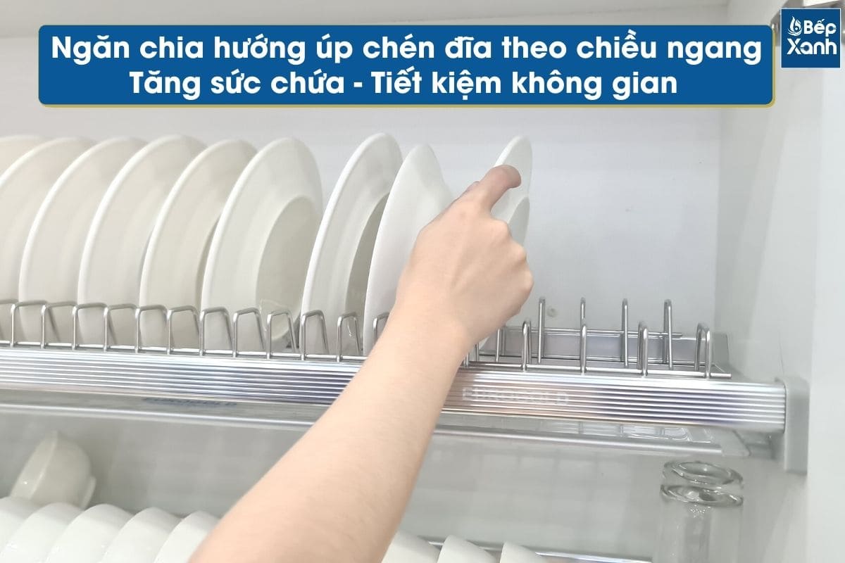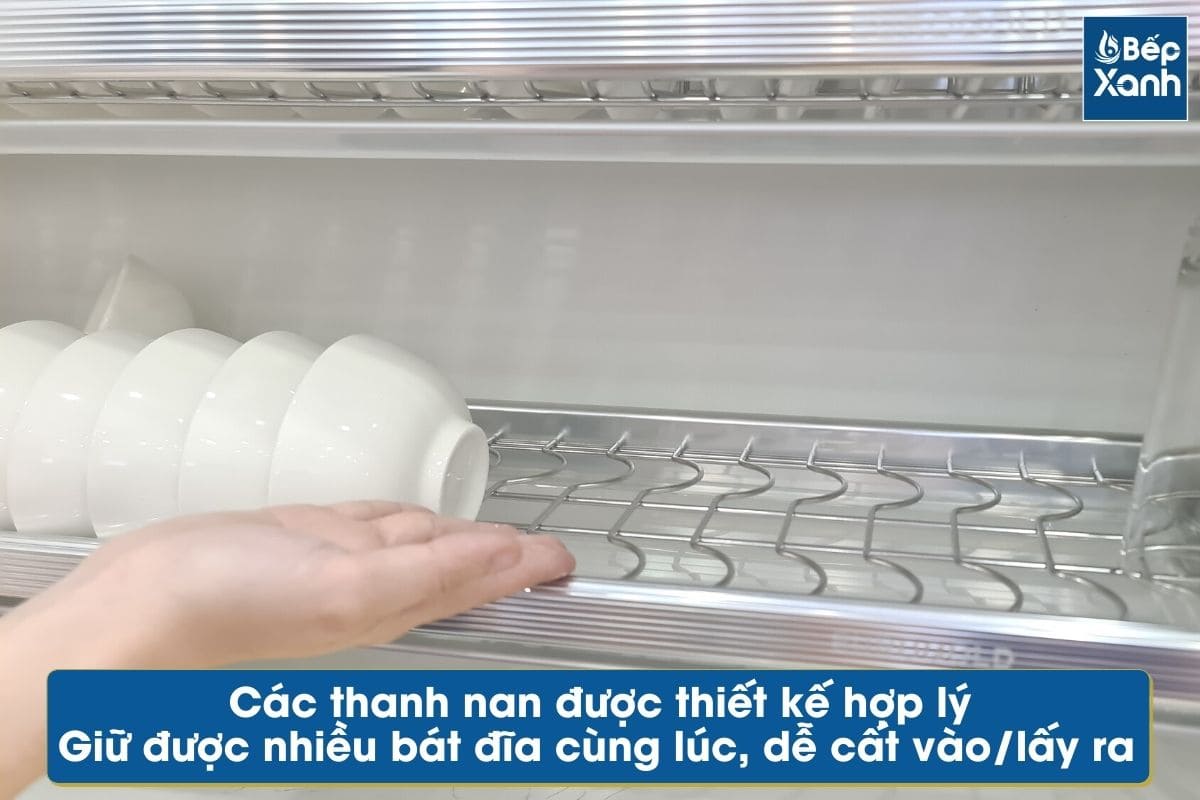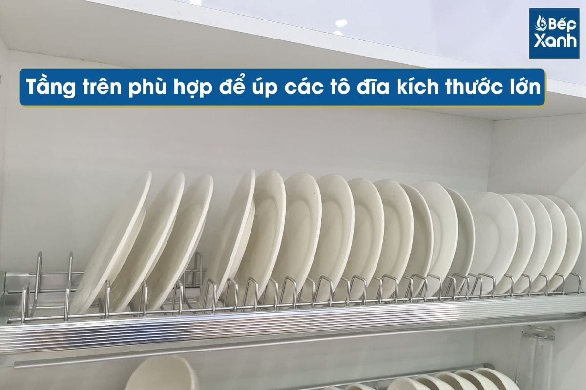 Tầng trên thiết kế dạng thanh thẳng đứng để úp các loại tô đĩa kích thước lớn, tạo nên tính khoa học và tiện lợi khi sử dụng.