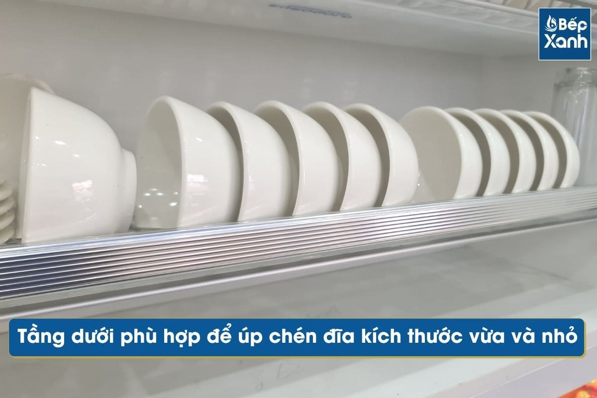 Tầng dưới thiết kế thanh dẹt nằm ngang phù hợp với các loại chén đĩa kích thước vừa và nhỏ.