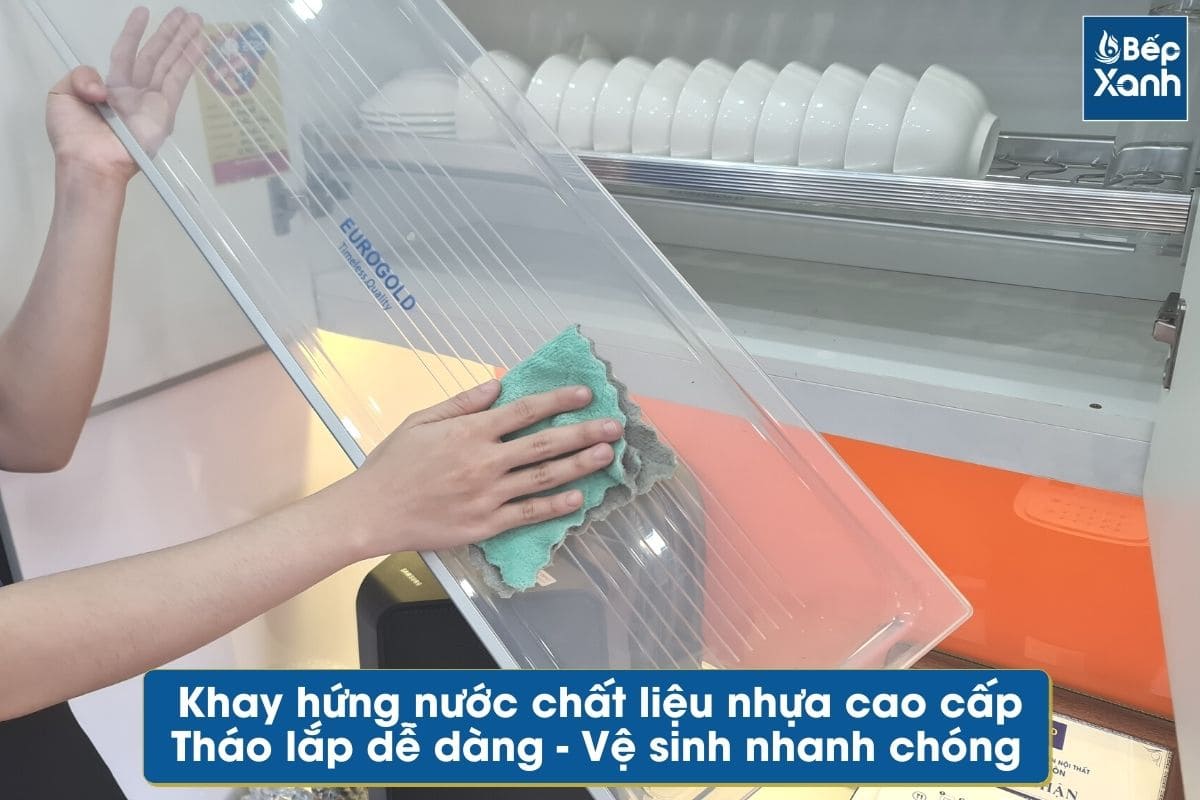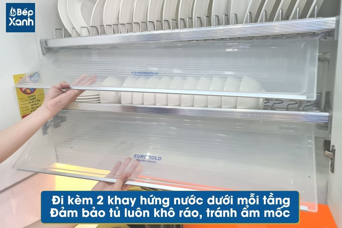 Ở dưới của mỗi tầng sẽ được trang bị thêm một khay hứng nước giúp cho tủ bếp luôn khô ráo và tránh tình trạng ẩm mốc xung quanh khu vực tủ. Đồng thời khay được thiết kế có thể tháo rời nên có thể lấy ra dễ dàng để vệ sinh, chất liệu khay nhựa cao cấp có độ trong nhất định, đảm bảo độ bền cao dù sử dụng trong thời gian dài.